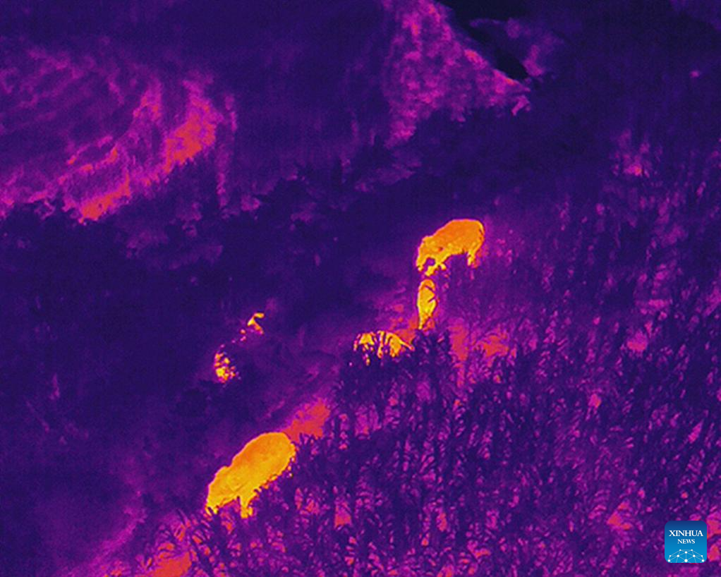 This aerial photo taken with a thermal imaging camera in the night of July 19, 2023 shows Asian elephants in Jiangcheng Hani and Yi Autonomous County of Pu'er, southwest China's Yunnan Province. (Photo by Diao Faxing/Xinhua)
