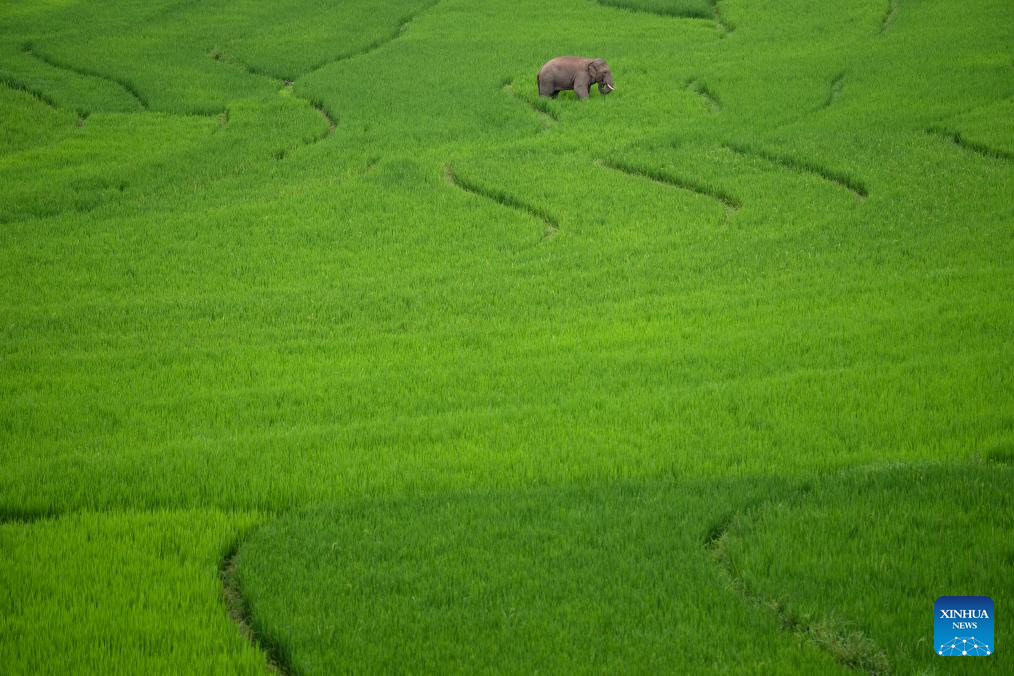 This aerial photo taken on July 19, 2023 shows an Asian elephant in rice fields in Jiangcheng Hani and Yi Autonomous County of Pu'er, southwest China's Yunnan Province. (Xinhua/Chen Xinbo)