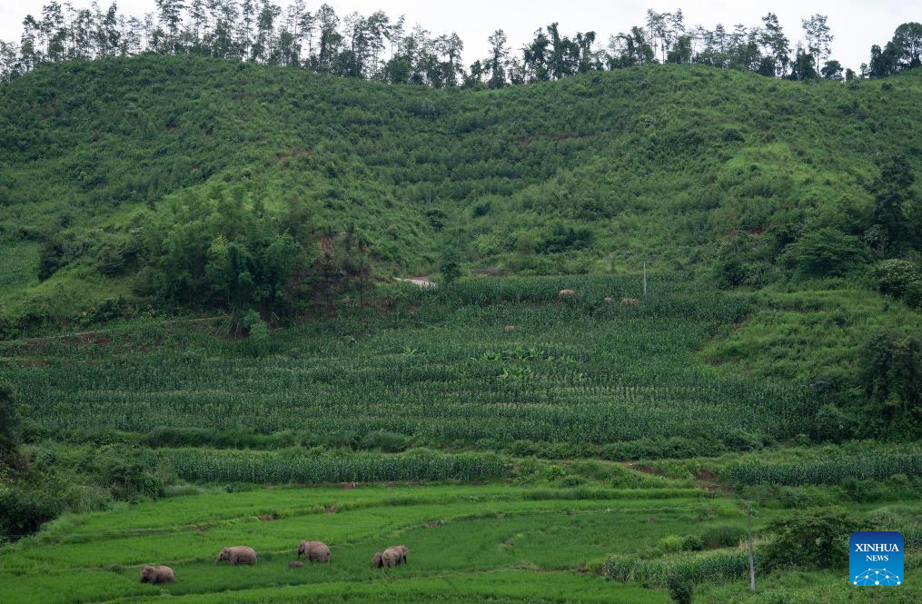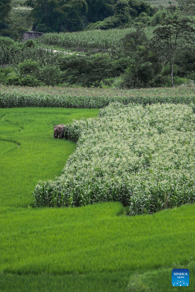 Asian elephants eat in rice and corn fields in Jiangcheng Hani and Yi Autonomous County of Pu'er, southwest China's Yunnan Province, July 19, 2023. (Xinhua/Fei Maohua)