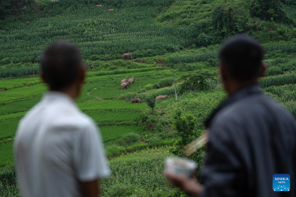 Villagers look at Asian elephants while having a meal in Jiangcheng Hani and Yi Autonomous County of Pu'er, southwest China's Yunnan Province, July 19, 2023. (Xinhua/Fei Maohua)