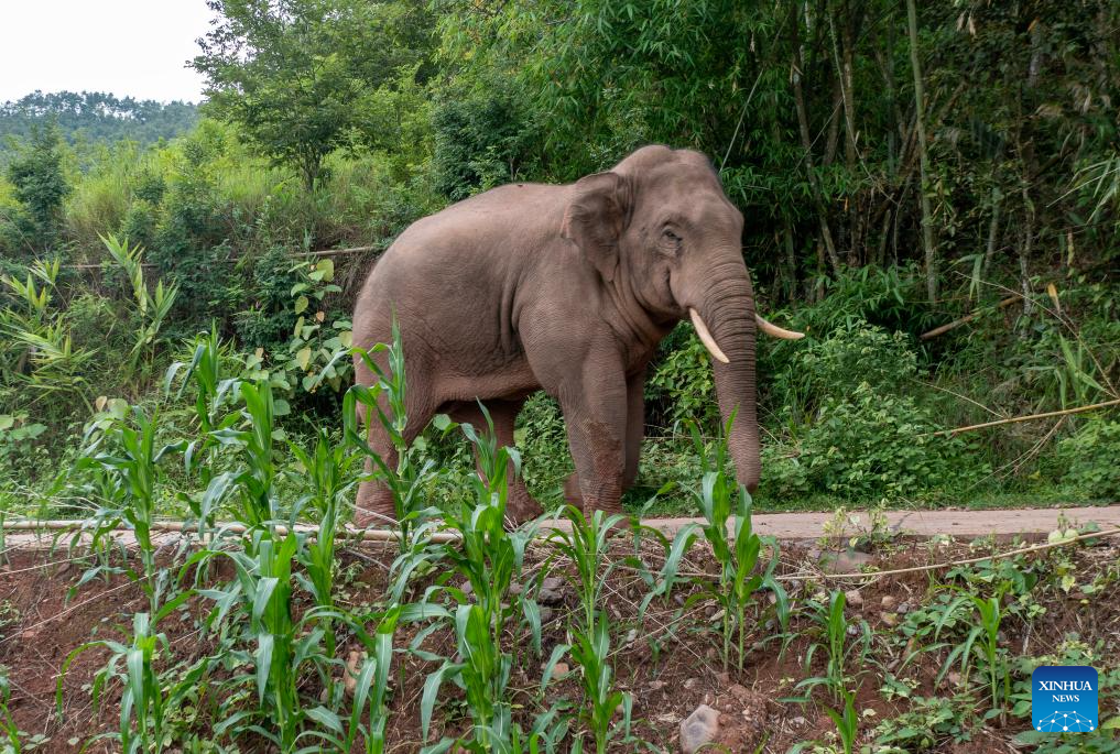 An Asian elephant eats in rice and corn fields in Jiangcheng Hani and Yi Autonomous County of Pu'er, southwest China's Yunnan Province, July 19, 2023. (Xinhua/Cui Wen)