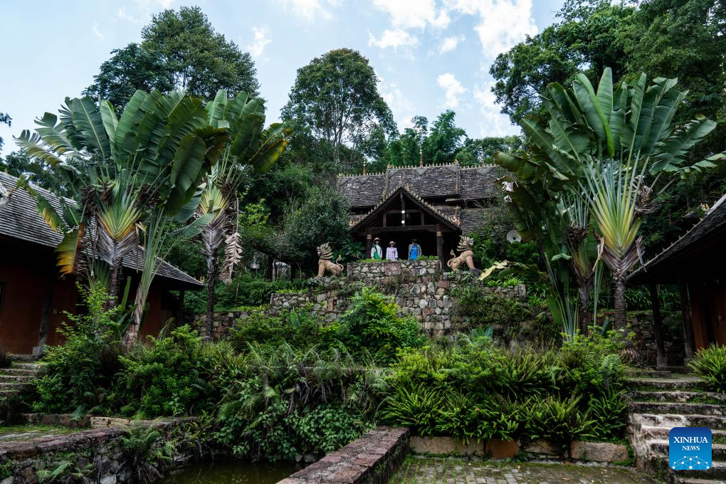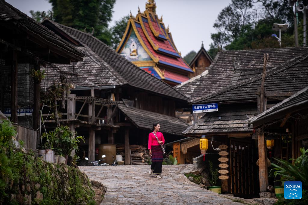 This photo taken on July 19, 2023 shows the Nuogan Village of Lancang Lahu Autonomous County, southwest China's Yunnan Province. In recent years, Lancang Lahu Autonomous County has harnessed its rich cultural and tourism resources, promoting high-quality integration of culture and tourism through industrial linkage and improving service systems. According to statistics, the county received over 3 million tourists from January to May in 2023, generating a comprehensive tourism revenue of 3.388 billion Yuan (about 0.47 billion U.S. dollars). (Xinhua/Hu Chao)