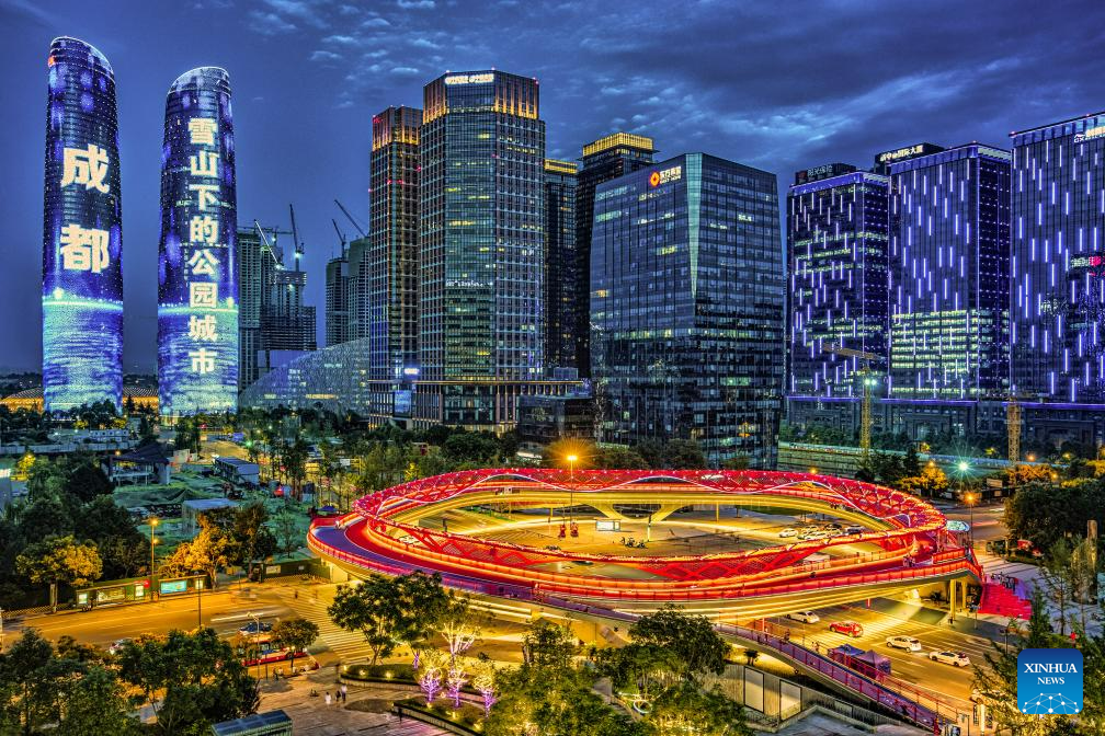 This photo taken on Aug. 27, 2021 shows a night view in Chengdu, southwest China's Sichuan Province.