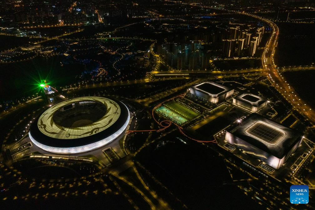 This aerial photo taken on April 19, 2023 shows the stadium for the opening ceremony of the Chengdu Universiade and other sports venues at Dong'an Lake Sports Park in Chengdu, southwest China's Sichuan Province.