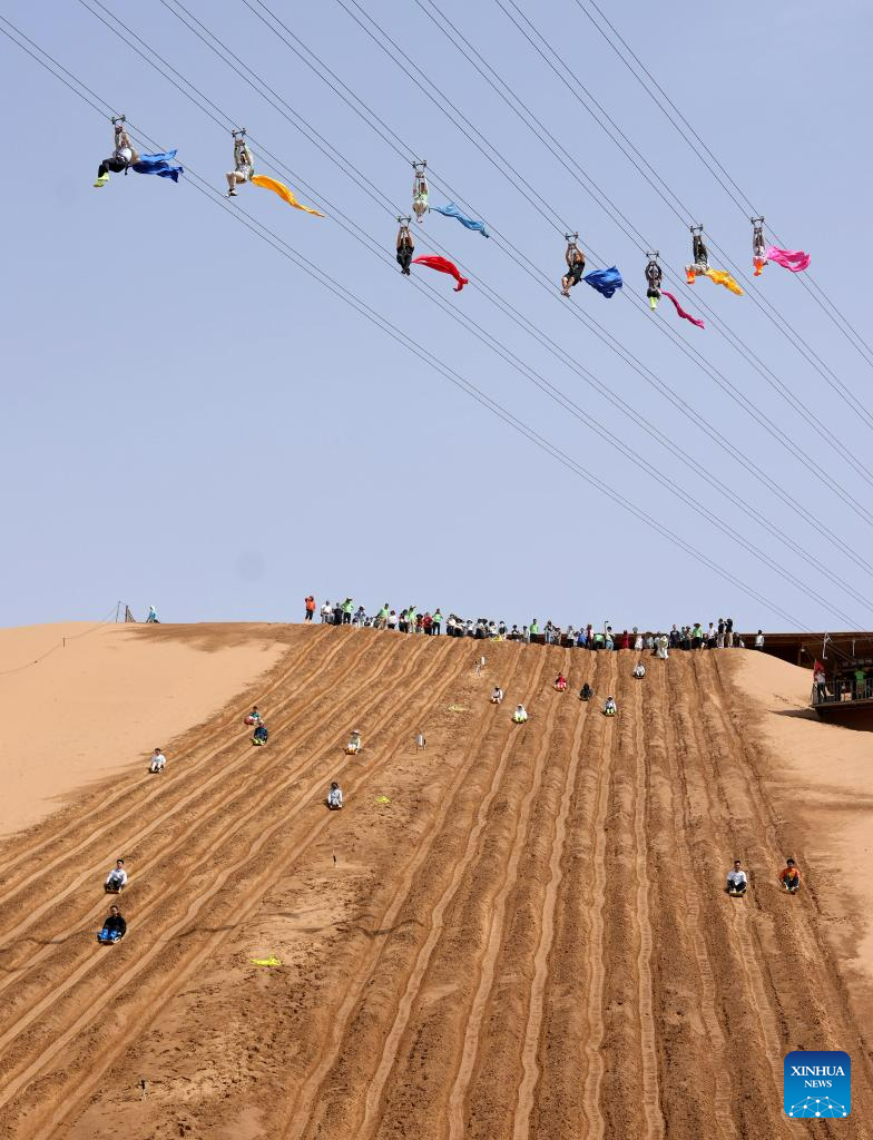 Visitors experience entertainment activities at the Shapotou scenic spot in Zhongwei, northwest China's Ningxia Hui Autonomous Region, July 20, 2023. Shapotou scenic spot in Zhongwei of northwest China's Ningxia has entered its peak tourism season during the summer vacation, with the largest daily visitor flow reaching over 10,000. (Xinhua/Wang Yuguo)