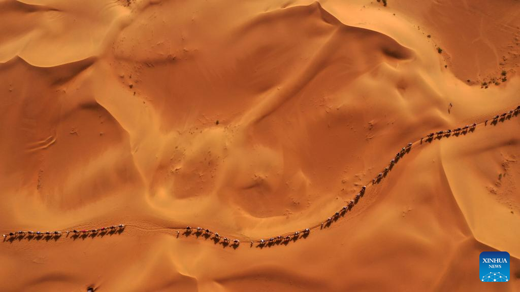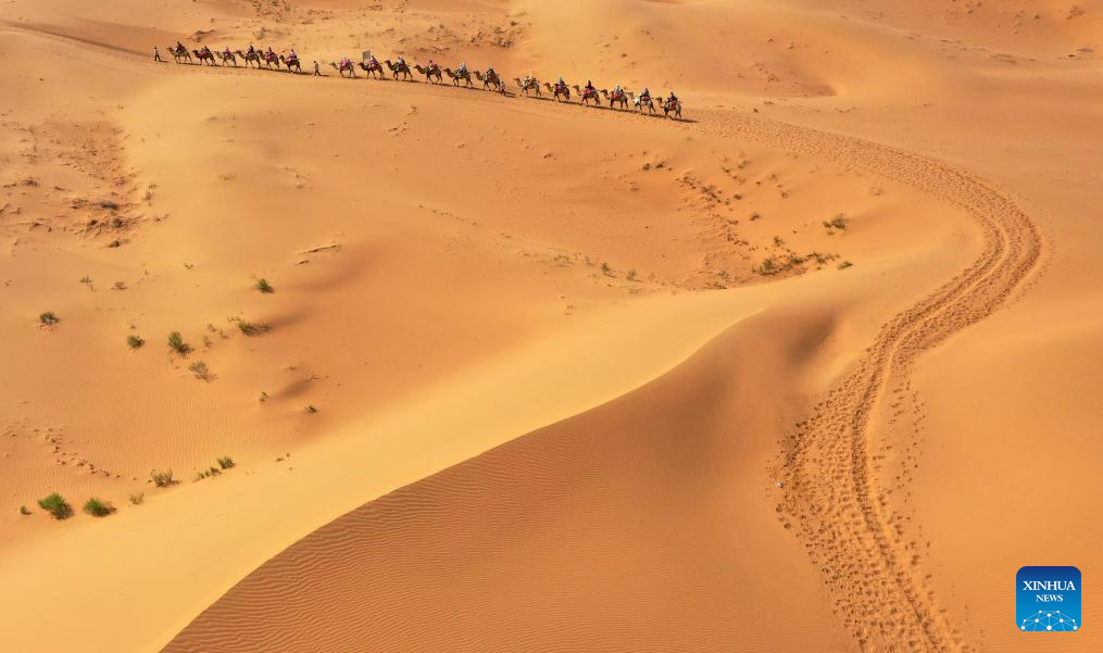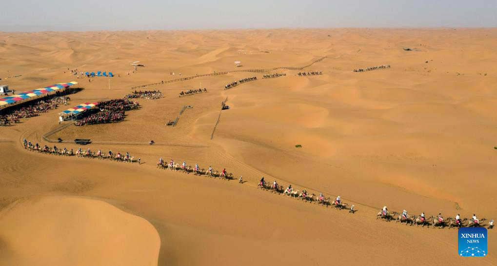 This aerial photo taken on July 20, 2023 shows visitors riding camels at the Shapotou scenic spot in Zhongwei, northwest China's Ningxia Hui Autonomous Region. Shapotou scenic spot in Zhongwei of northwest China's Ningxia has entered its peak tourism season during the summer vacation, with the largest daily visitor flow reaching over 10,000. (Xinhua/Wang Yuguo)