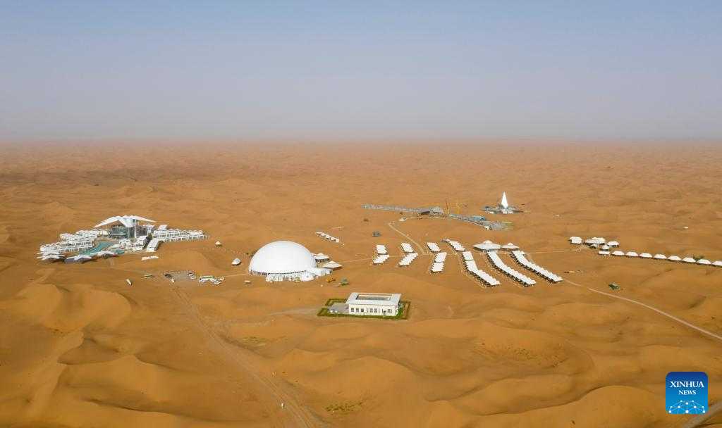 This aerial photo taken on July 20, 2023 shows a resort in the Tengger Desert in the Shapotou scenic spot in Zhongwei, northwest China's Ningxia Hui Autonomous Region. Shapotou scenic spot in Zhongwei of northwest China's Ningxia has entered its peak tourism season during the summer vacation, with the largest daily visitor flow reaching over 10,000. (Xinhua/Wang Peng)