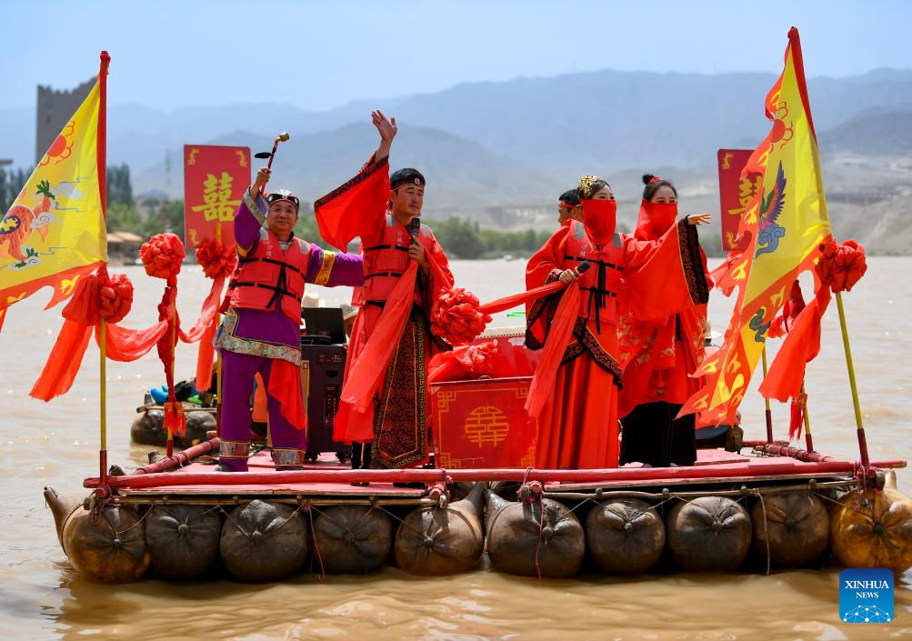 Actors perform "wedding ceremony on sheepskin rafts" at the Shapotou scenic spot in Zhongwei, northwest China's Ningxia Hui Autonomous Region, July 20, 2023. Shapotou scenic spot in Zhongwei of northwest China's Ningxia has entered its peak tourism season during the summer vacation, with the largest daily visitor flow reaching over 10,000. (Xinhua/Feng Kaihua)
