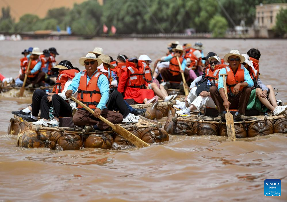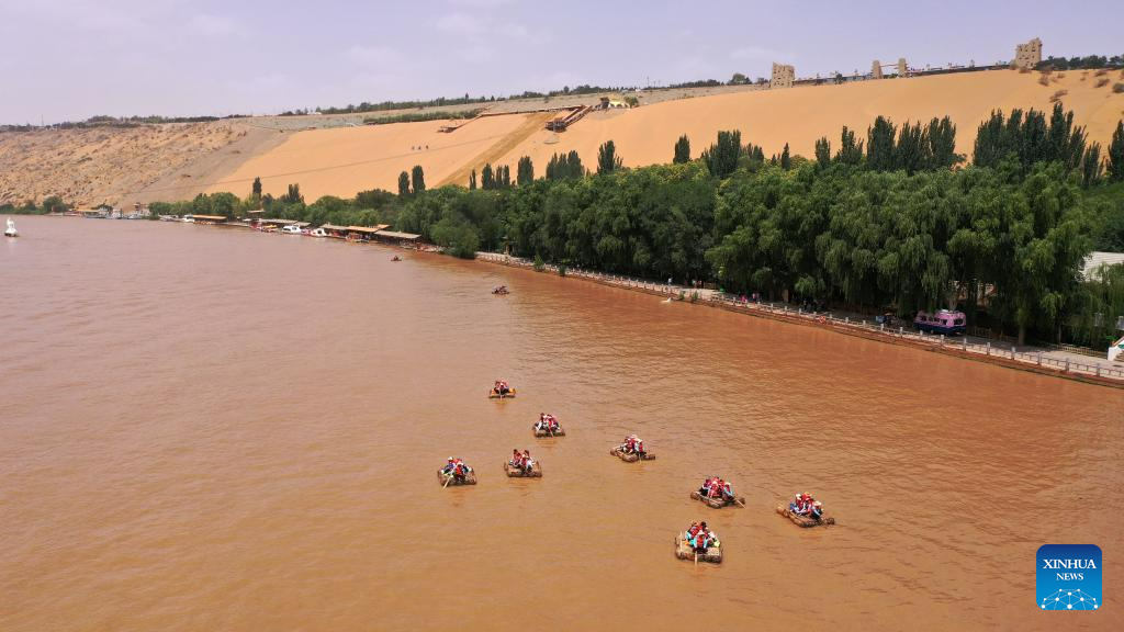 Visitors take sheepskin rafts at the Shapotou scenic spot in Zhongwei, northwest China's Ningxia Hui Autonomous Region, July 20, 2023. Shapotou scenic spot in Zhongwei of northwest China's Ningxia has entered its peak tourism season during the summer vacation, with the largest daily visitor flow reaching over 10,000. (Xinhua/Wang Yuguo)
