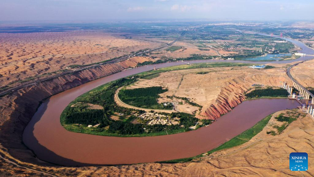 This aerial photo taken on July 20, 2023 shows the Shapotou scenic spot where the desert meets the Yellow River in Zhongwei, northwest China's Ningxia Hui Autonomous Region. Shapotou scenic spot in Zhongwei of northwest China's Ningxia has entered its peak tourism season during the summer vacation, with the largest daily visitor flow reaching over 10,000. (Xinhua/Wang Peng)
