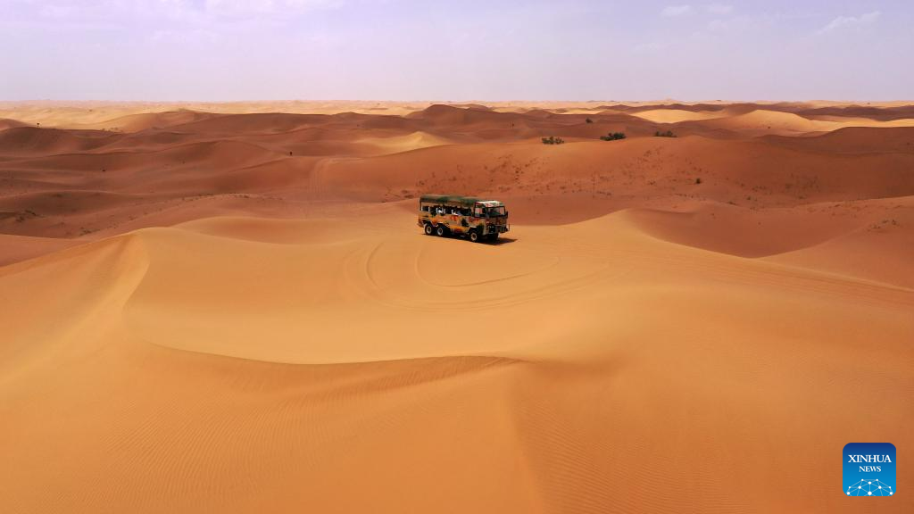 This aerial photo taken on July 20, 2023 shows visitors taking a desert surfing vehicle at the Shapotou scenic spot in Zhongwei, northwest China's Ningxia Hui Autonomous Region. Shapotou scenic spot in Zhongwei of northwest China's Ningxia has entered its peak tourism season during the summer vacation, with the largest daily visitor flow reaching over 10,000. (Xinhua/Wang Peng)