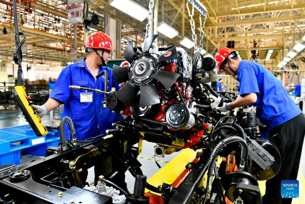 Workers assemble automobiles at the production line of Weichai New Energy Commercial Vehicle Co., Ltd. in Wendeng District of Weihai City, east China's Shandong Province, July 21, 2023.