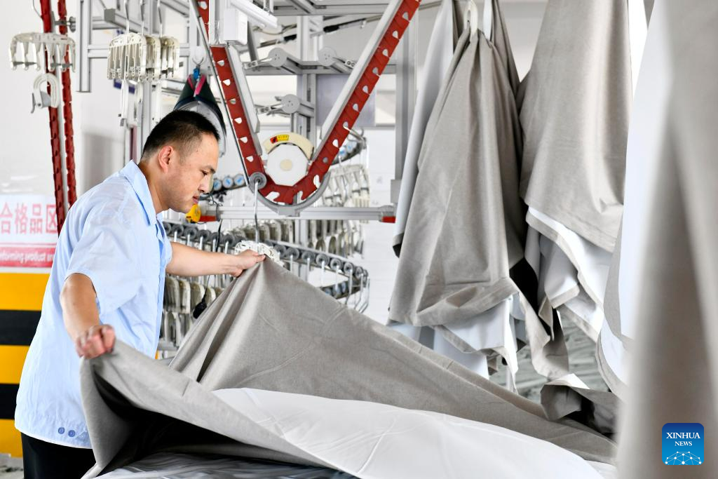Workers process textile products at a home textile company in Wendeng District of Weihai City, east China's Shandong Province, July 21, 2023.