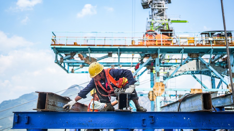 Staff members work at the construction site of Zangke River grand bridge on the expressway linking Nayong and Qinglong in southwest China's Guizhou Province, June 25, 2023. (Xinhua/Tao Liang)