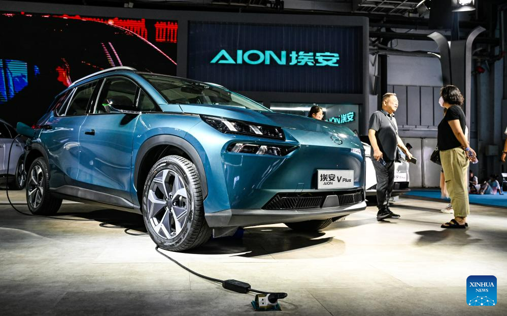 A GAC Aion V Plus vehicle is displayed during the 20th Changchun International Auto Expo in Changchun, capital of northeast China's Jilin Province, July 20, 2023.
