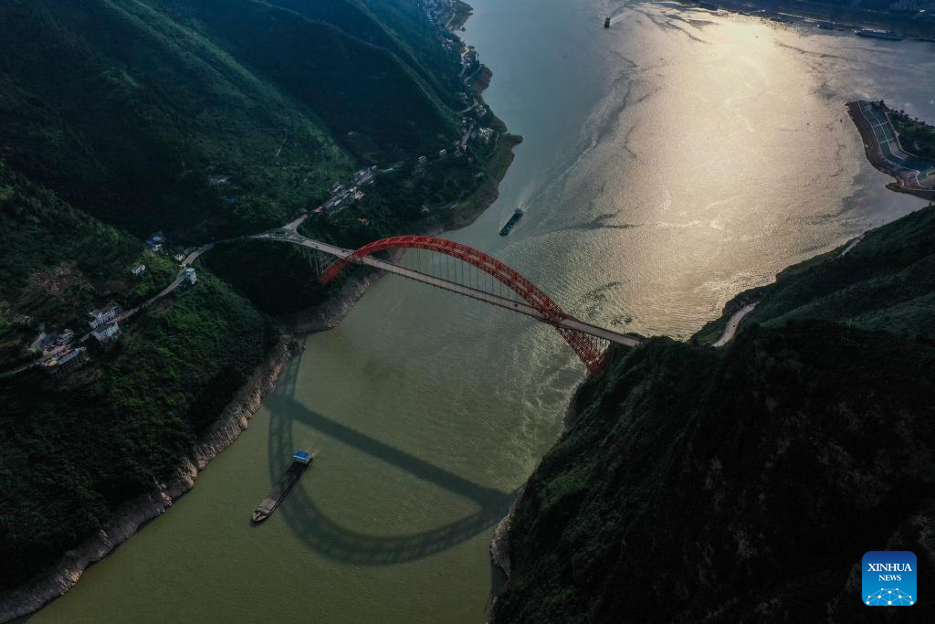 This aerial photo taken on June 27, 2023 shows the Wushan Yangtze River Bridge at Wuxia Gorge, one of the Three Gorges on the Yangtze River, in southwest China's Chongqing Municipality. Located in the upper reaches of the Yangtze River, the Three Gorges Reservoir area is an important ecological function zone and reservoir of freshwater resources in China.