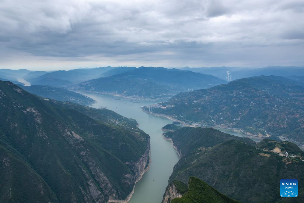 This aerial photo taken on July 1, 2023 shows the scenery of Qutang Gorge, one of the Three Gorges on the Yangtze River, in southwest China's Chongqing Municipality. Located in the upper reaches of the Yangtze River, the Three Gorges Reservoir area is an important ecological function zone and reservoir of freshwater resources in China.