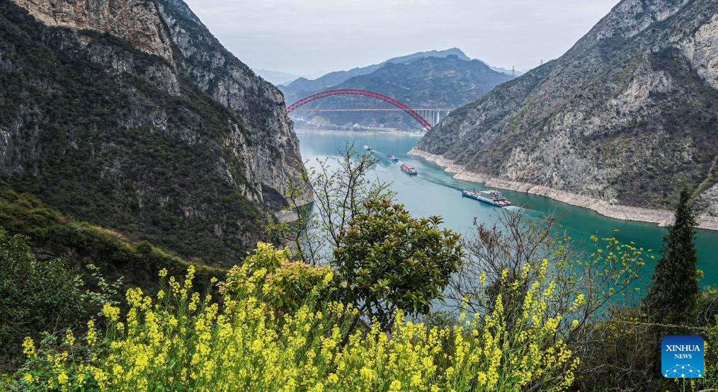 This photo taken on March 28, 2023 shows the scenery of Xiling Gorge, one of the Three Gorges on the Yangtze River, in central China's Hubei Province. Located in the upper reaches of the Yangtze River, the Three Gorges Reservoir area is an important ecological function zone and reservoir of freshwater resources in China.