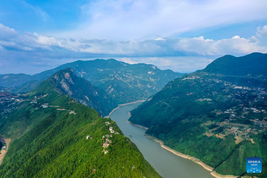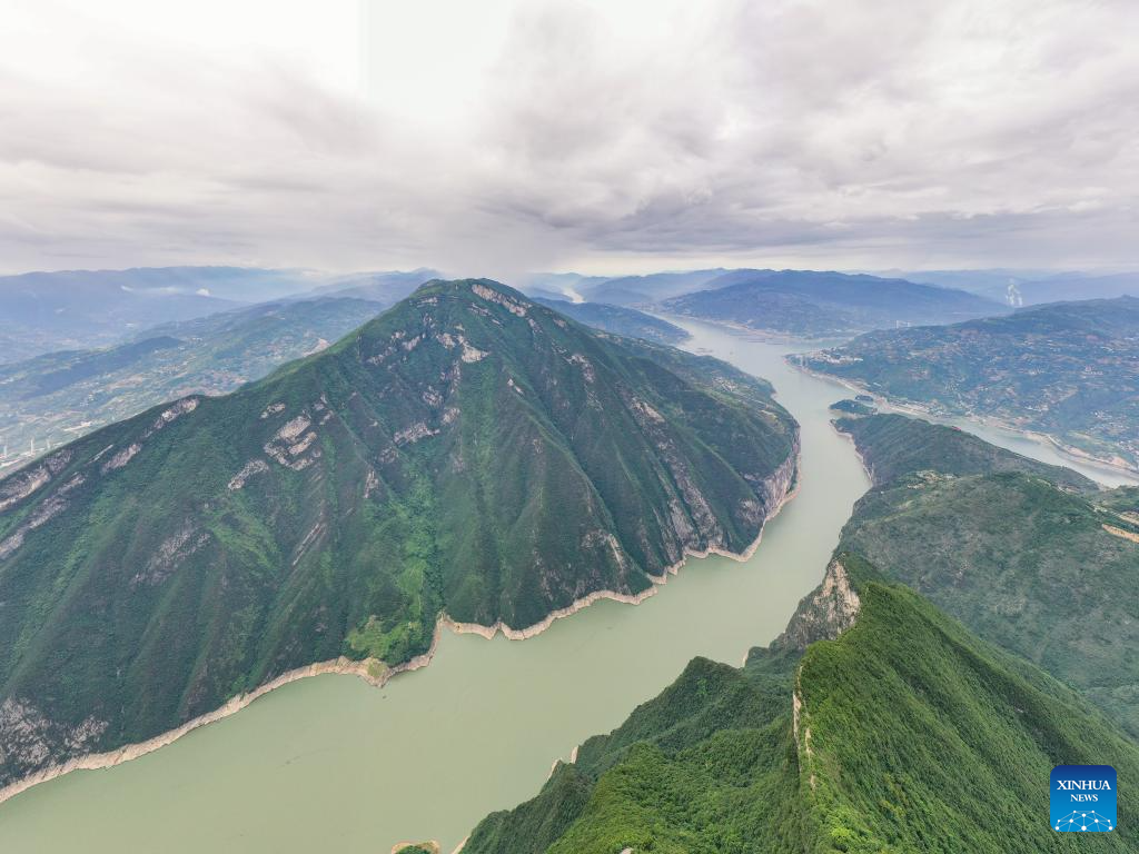 This aerial photo taken on June 30, 2023 shows the scenery of Wuxia Gorge, one of the Three Gorges on the Yangtze River, in southwest China's Chongqing Municipality. Located in the upper reaches of the Yangtze River, the Three Gorges Reservoir area is an important ecological function zone and reservoir of freshwater resources in China.