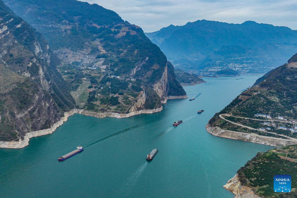 This photo taken on March 11, 2023 shows the scenery of Xiling Gorge, one of the Three Gorges on the Yangtze River, in central China's Hubei Province. Located in the upper reaches of the Yangtze River, the Three Gorges Reservoir area is an important ecological function zone and reservoir of freshwater resources in China.