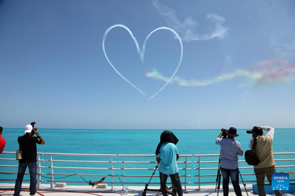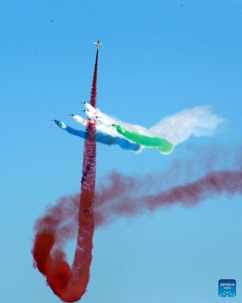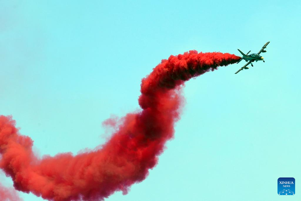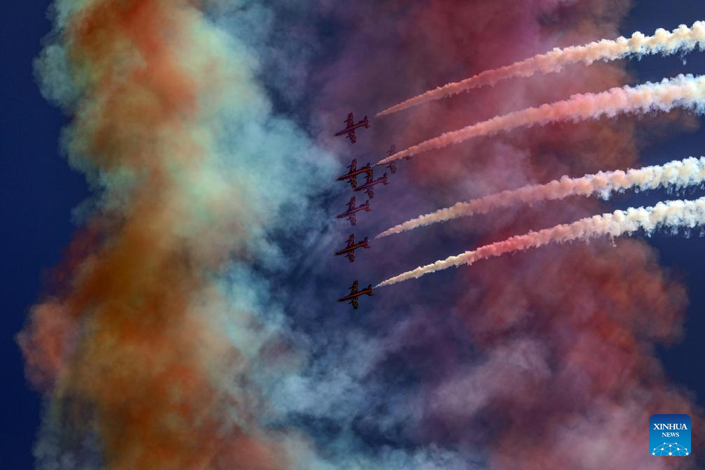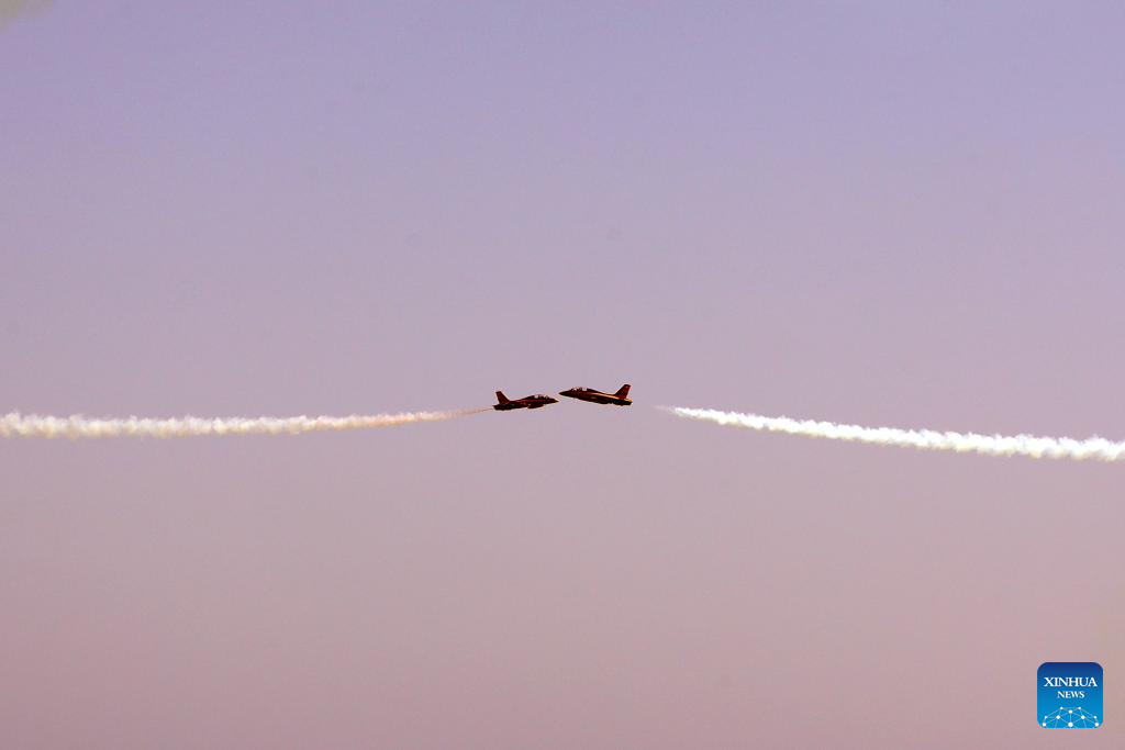 Aircrafts perform aerobatics during the El-Alamein Air Show 2023 in the New Alamein City, Egypt, July 23, 2023. Aircrafts from Egypt and the United Arab Emirates (UAE) on Sunday jointly staged the El-Alamein Air Show 2023 at the Mediterranean coastal city of New Alamein. (Xinhua/Ahmed Gomaa)
