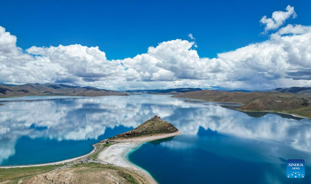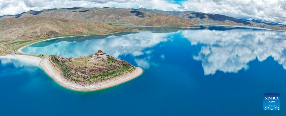 This aerial photo taken on July 22, 2023 shows the Rituo Temple on the north shore of Yumzhog Yumco Lake in southwest China's Tibet Autonomous Region. (Xinhua/Nie Yi)