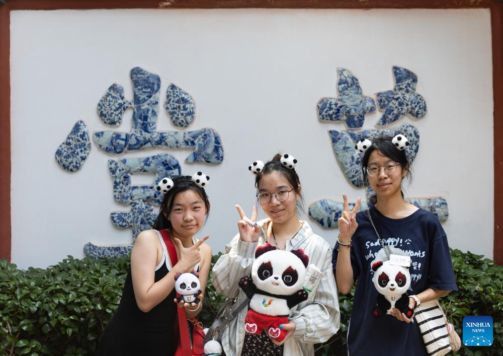 Tourists pose for photos with Rongbao, mascot of the Chengdu Universiade, in Chengdu, southwest China's Sichuan province, July 19, 2023. The 31st International University Sports Federation (FISU) Summer World University Games will be held in Chengdu from July 28 to August 8. (Xinhua/Jiang Hongjing)