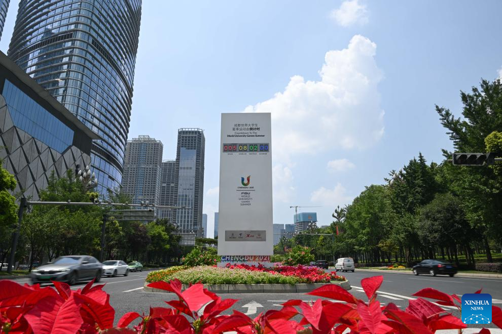 Photo taken on July 23, 2023 shows a countdown clock for the Chengdu Universiade in Chengdu, southwest China's Sichuan Province. The 31st International University Sports Federation (FISU) Summer World University Games will be held in Chengdu from July 28 to August 8. (Xinhua/Xu Bingjie)