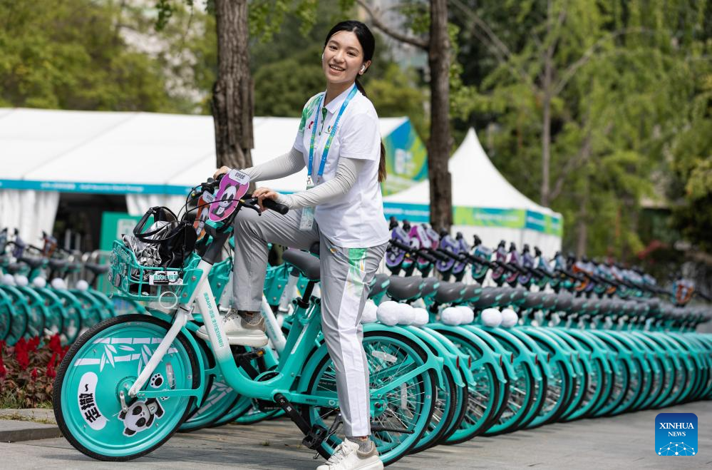 A volunteer rides a shared bicycle customized for the Chengdu Universiade in Chengdu, southwest China's Sichuan province, July 20, 2023. The 31st International University Sports Federation (FISU) Summer World University Games will be held in Chengdu from July 28 to August 8. (Xinhua/Jiang Hongjing)