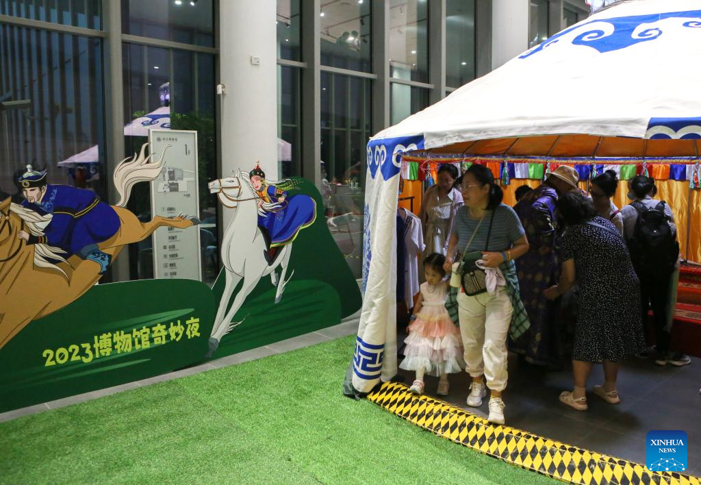People visit a night fair at Minhang Museum of Shanghai in east China to experience the traditional Mongolian custom, July 21, 2023. The night fair was held on the sidelines of an exhibition featuring bronze ware from the city of Ordos, north China's Inner Mongolia Autonomous Region. (Xinhua/Xin Mengchen)