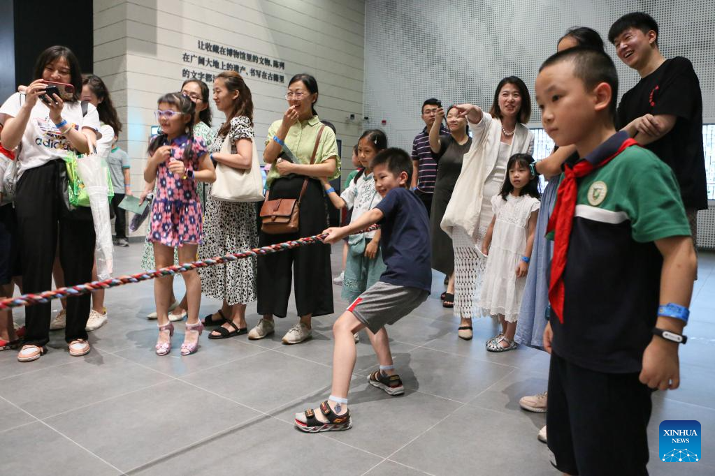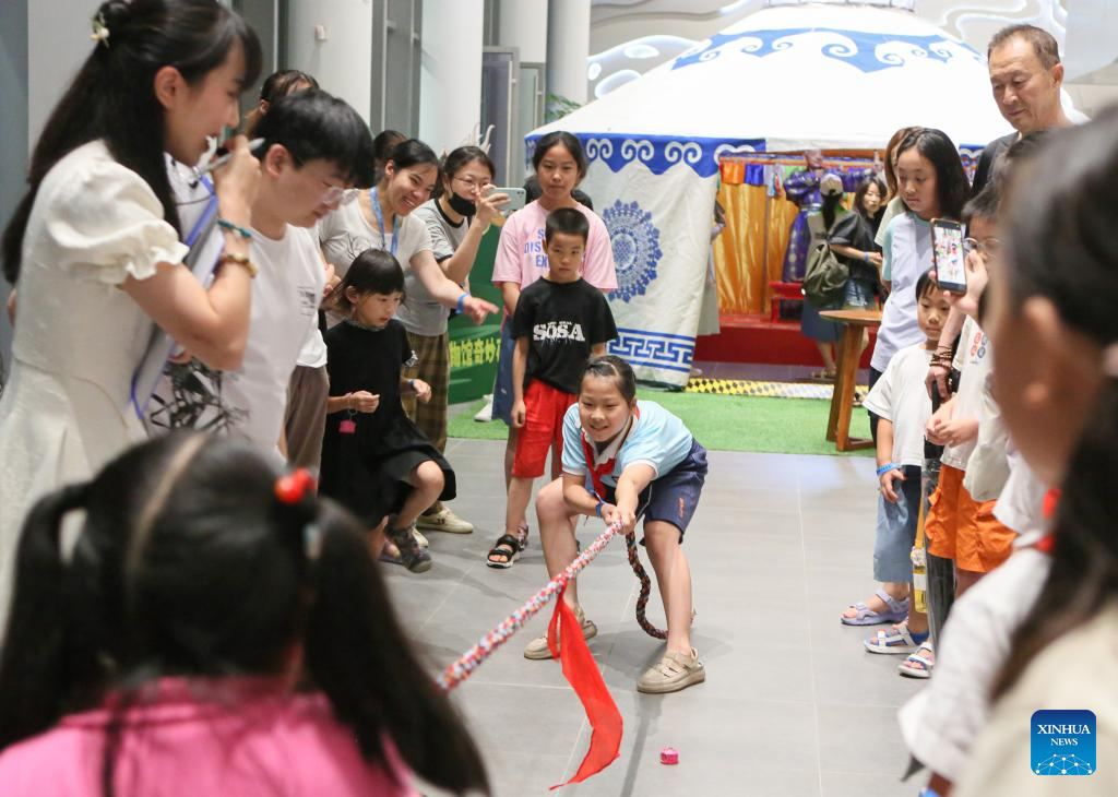 Children take part in a traditional tug-of-war game at a night fair at Minhang Museum of Shanghai in east China to experience the traditional Mongolian custom, July 21, 2023. The night fair was held on the sidelines of an exhibition featuring bronze ware from the city of Ordos, north China's Inner Mongolia Autonomous Region. (Xinhua/Xin Mengchen)