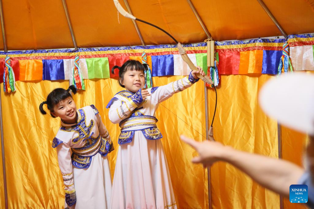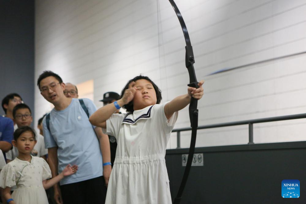 A girl experiences archery at a night fair at Minhang Museum of Shanghai in east China to experience the traditional Mongolian custom, July 21, 2023. The night fair was held on the sidelines of an exhibition featuring bronze ware from the city of Ordos, north China's Inner Mongolia Autonomous Region. (Xinhua/Xin Mengchen)