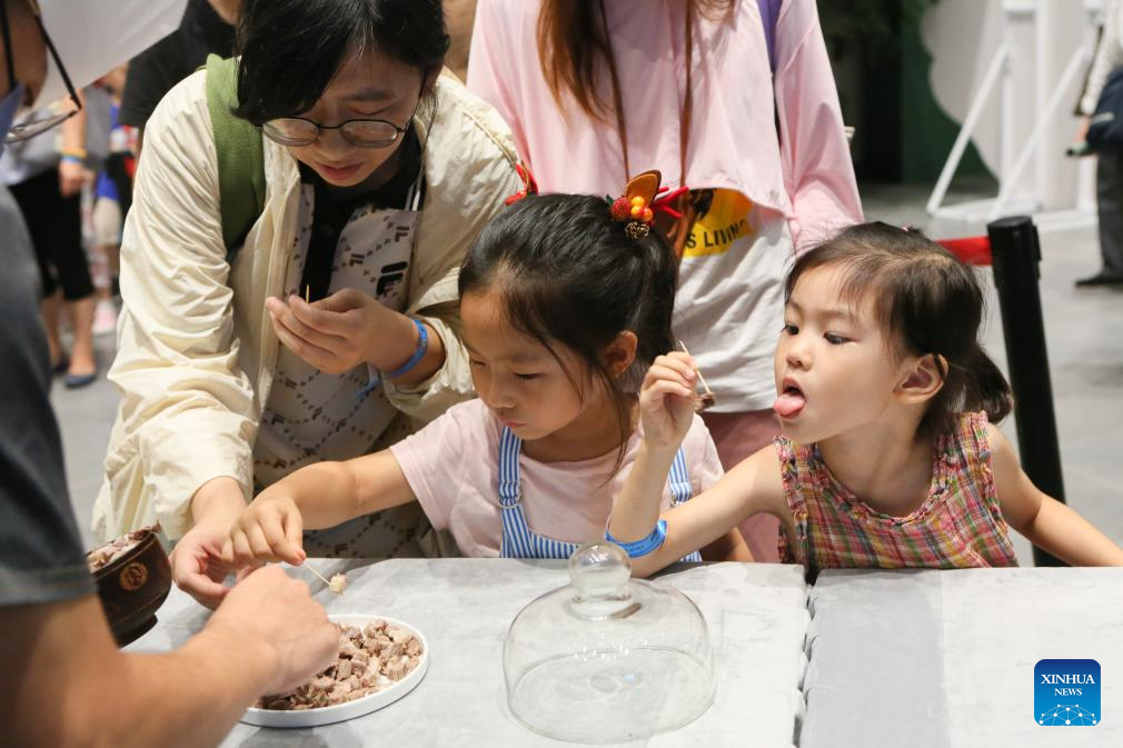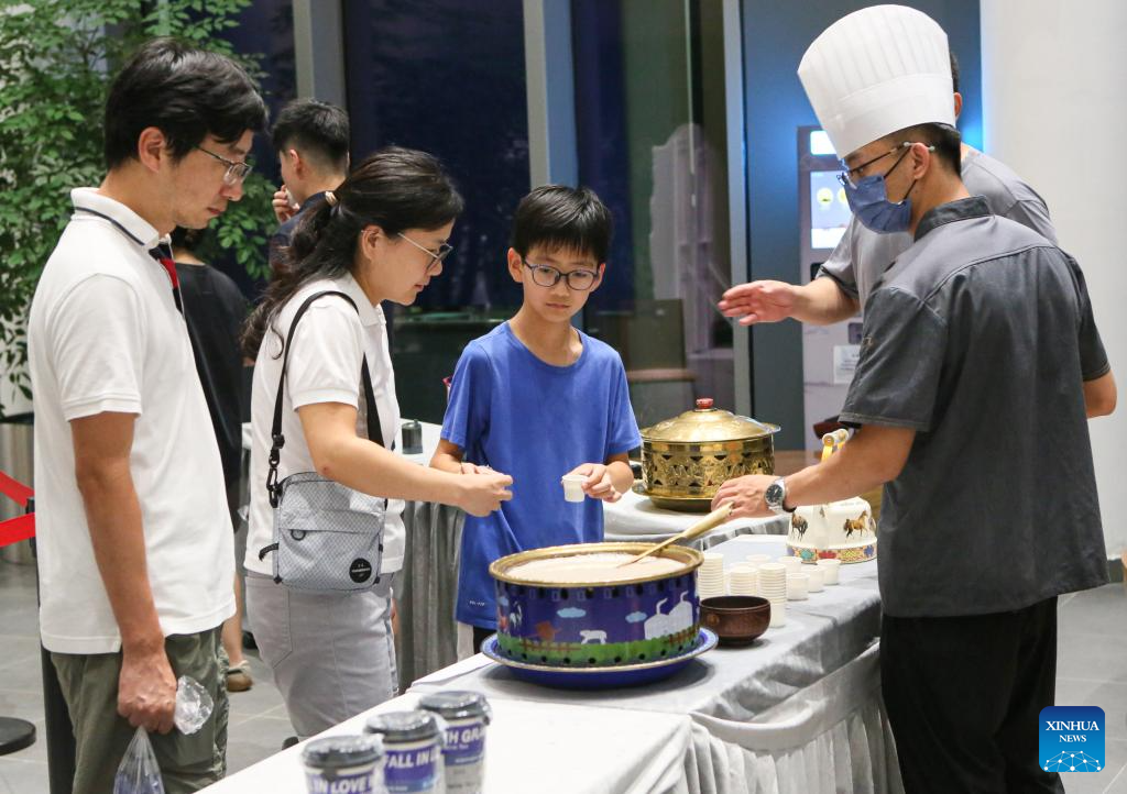 Visitors taste Mongolian specialty food at a night fair at Minhang Museum of Shanghai in east China to experience the traditional Mongolian custom, July 21, 2023. The night fair was held on the sidelines of an exhibition featuring bronze ware from the city of Ordos, north China's Inner Mongolia Autonomous Region. (Xinhua/Xin Mengchen)