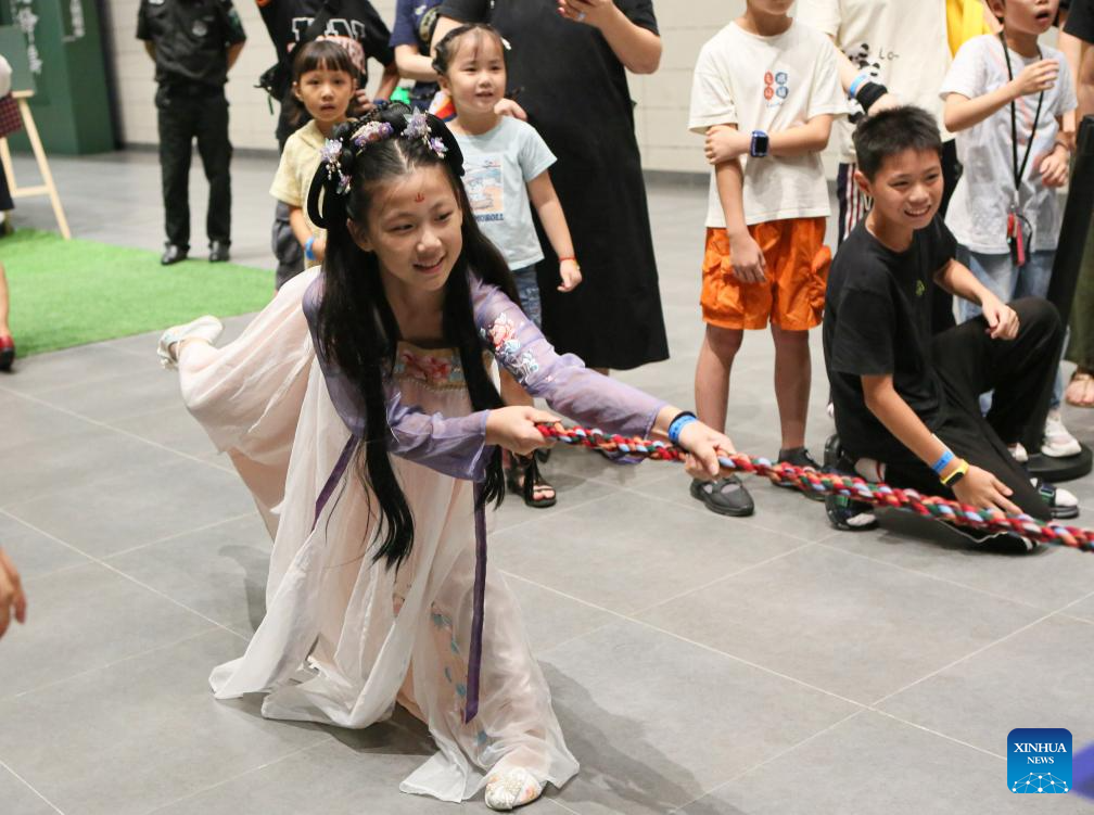 A girl takes part in a traditional tug-of-war game at a night fair at Minhang Museum of Shanghai in east China to experience the traditional Mongolian custom, July 21, 2023. The night fair was held on the sidelines of an exhibition featuring bronze ware from the city of Ordos, north China's Inner Mongolia Autonomous Region. (Xinhua/Xin Mengchen)