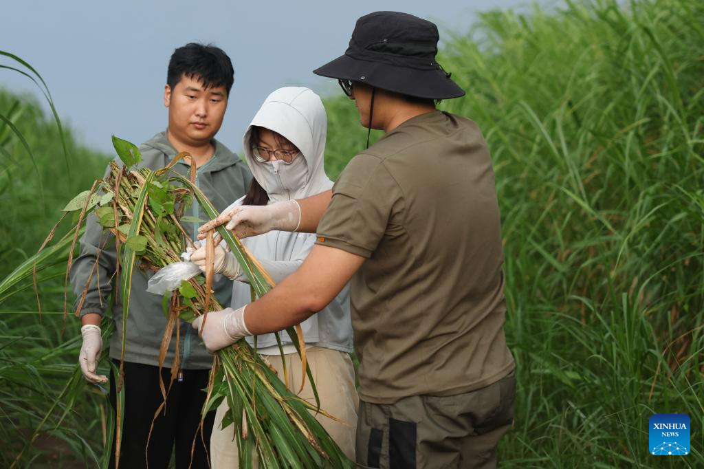 Members of the Dongting Lake Station for Wetland Ecosystem Research under the CAS prepare plant samples in the east Dongting Lake nature reserve, central China's Hunan Province, July 9, 2023. (Xinhua/Xue Yuge)