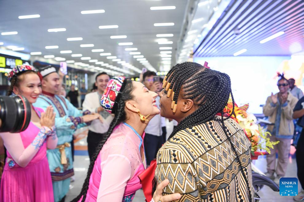 URUMQI, July 24 (Xinhua) -- As South African dancer Luyanda Mdingji stepped off the plane at Urumqi Airport in the capital of northwest China's Xinjiang Uygur Autonomous Region late Sunday, he was greeted with a heartfelt welcome. Caught up in the vibrant drum beats, he couldn't resist swaying his waist and hips while waving his arms in sync with the music.