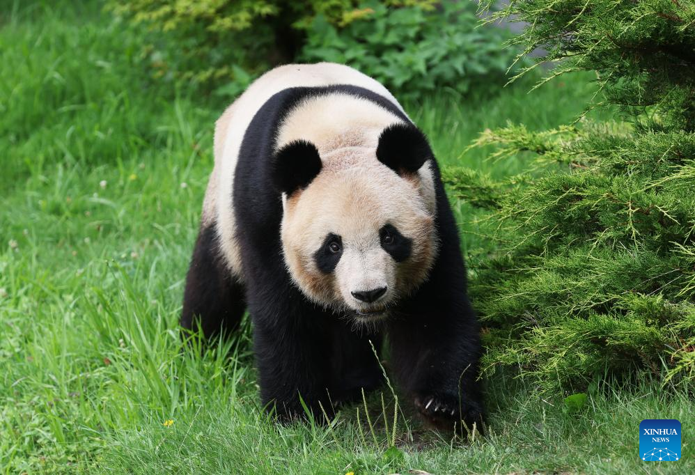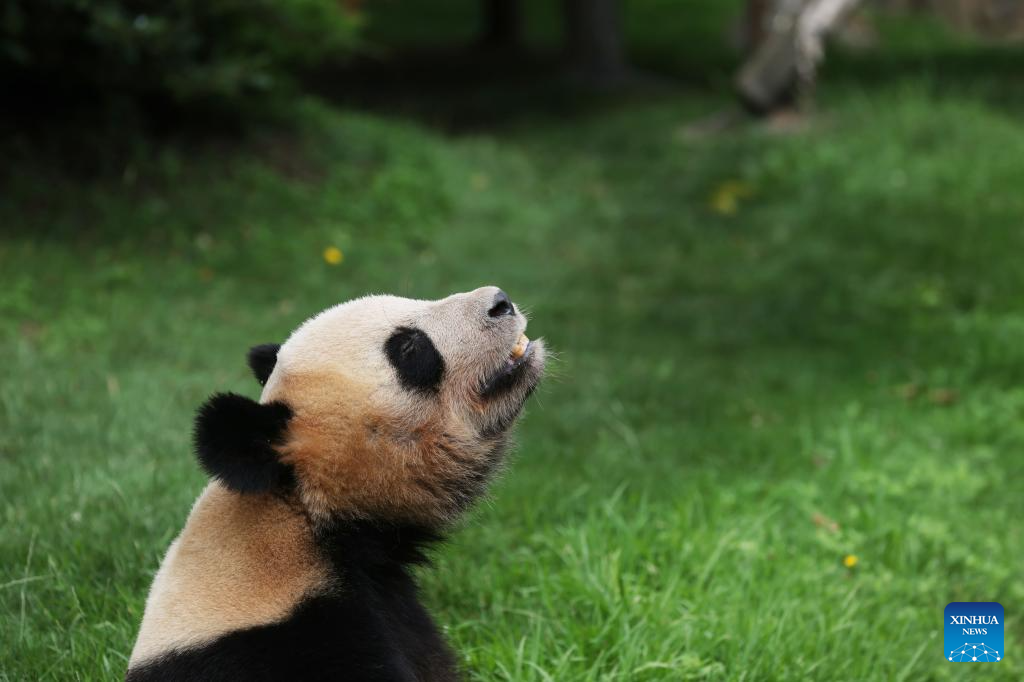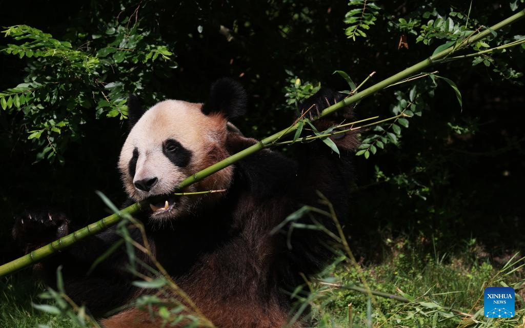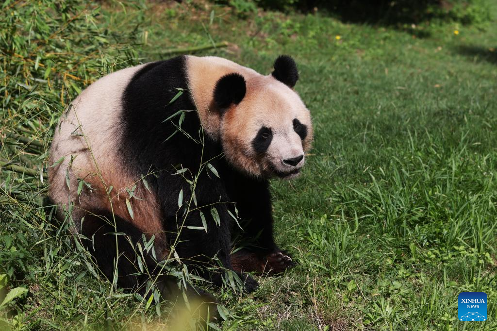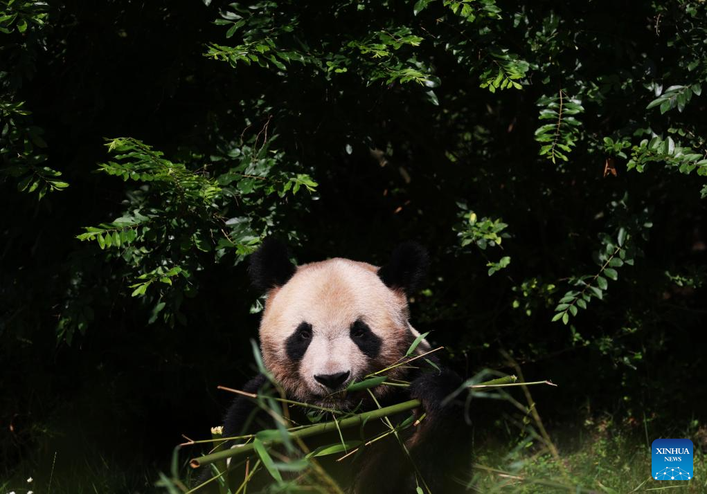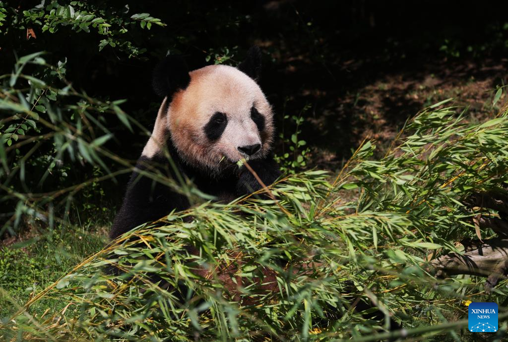 This photo taken on July 24, 2023 shows the giant panda Yuan Meng at Beauval Zoo in Saint-Aignan, France. Yuan Meng, the first giant panda born in France in 2017, will return to China on Tuesday. (Xinhua/Gao Jing)