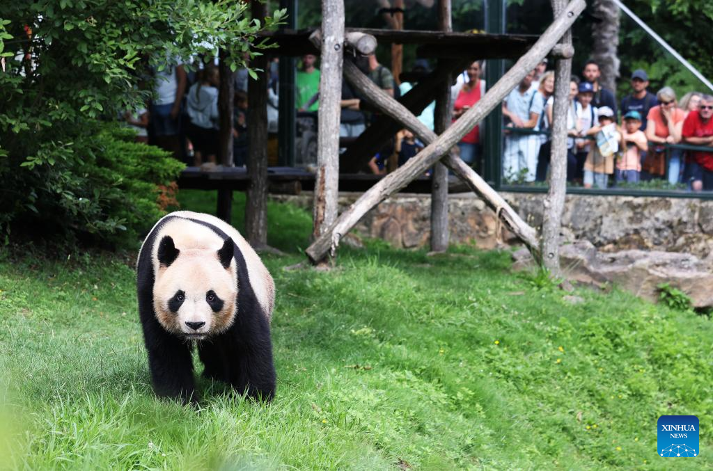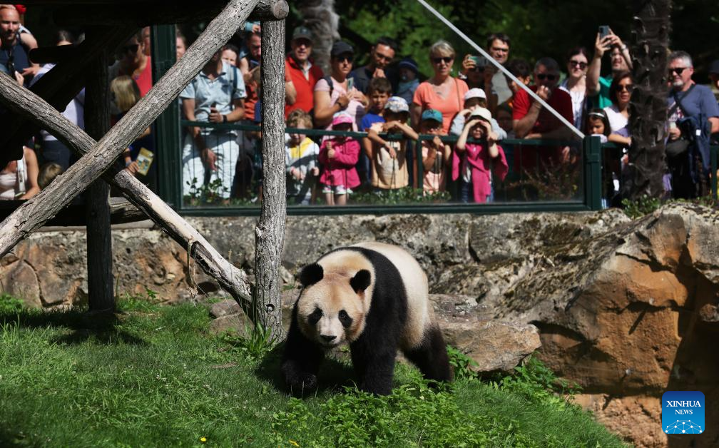 People watch the giant panda Yuan Meng at Beauval Zoo in Saint-Aignan, France, on July 24, 2023. Yuan Meng, the first giant panda born in France in 2017, will return to China on Tuesday. (Xinhua/Gao Jing)