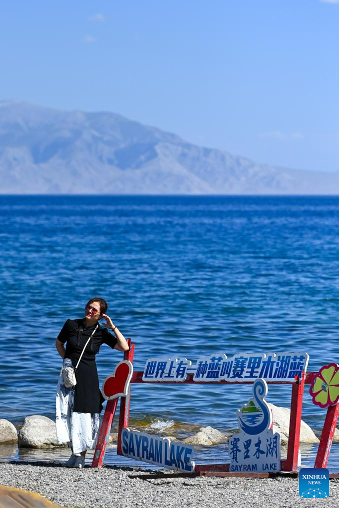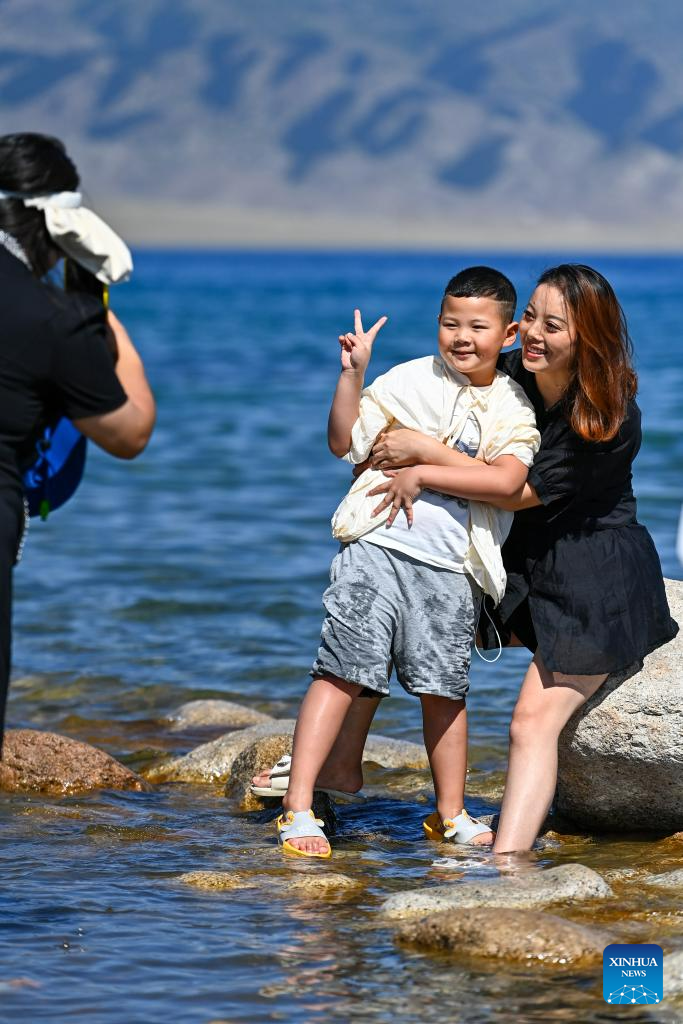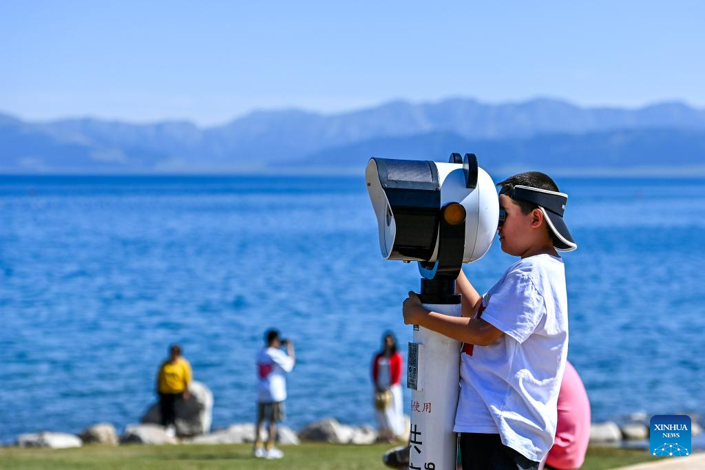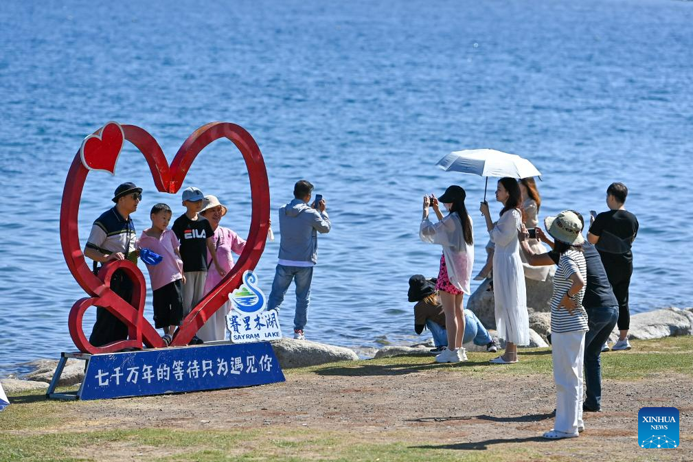 Tourists visit Sayram Lake in Bortala Mongolian Autonomous Prefecture, northwest China's Xinjiang Uygur Autonomous Region, July 25, 2023. (Xinhua/Ding Lei)