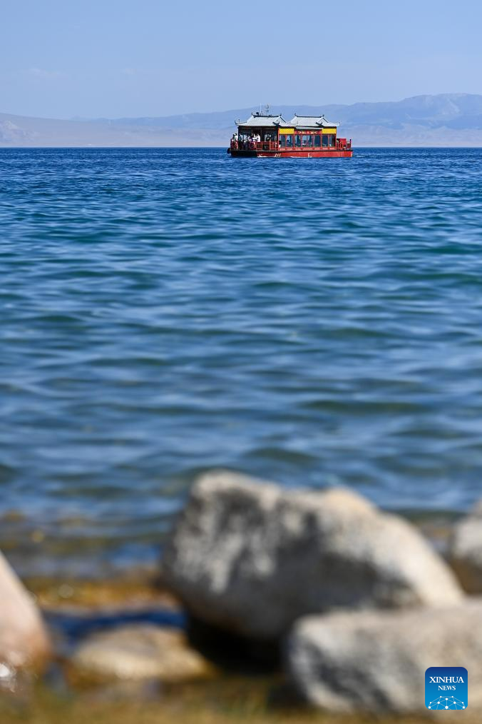 Tourists visit Sayram Lake by boat in Bortala Mongolian Autonomous Prefecture, northwest China's Xinjiang Uygur Autonomous Region, July 25, 2023. (Xinhua/Ding Lei)