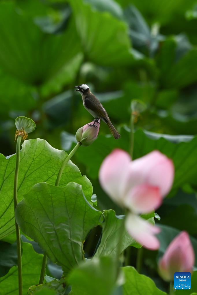 A light-vented bulbul rests on a lotus flower in the West Lake scenic area in Hangzhou, capital of east China's Zhejiang Province, June 25, 2023. In summer, the blossoming lotus flowers are a must-see for visitors to Hangzhou's West Lake. (Xinhua/Huang Zongzhi)