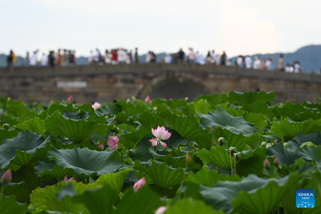 Tourists enjoy lotus flowers in the West Lake scenic area in Hangzhou, capital of east China's Zhejiang Province, July 25, 2023. In summer, the blossoming lotus flowers are a must-see for visitors to Hangzhou's West Lake. (Xinhua/Huang Zongzhi)