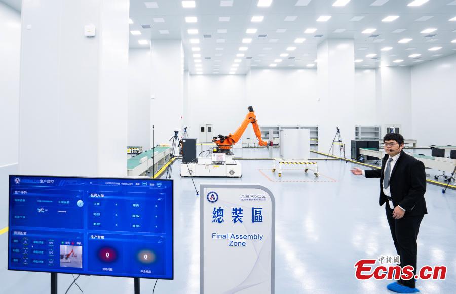 Technical personnel demonstrate the operations at the Hong Kong Satellite Manufacturing Center, July 25, 2023. (Photo: China News Service/Hou Yu)