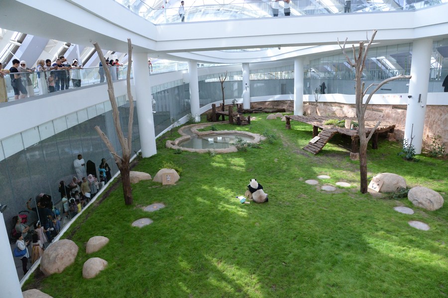 Qatar, located in the Middle East on the Gulf, has a hot climate, with summer temperatures reaching 50 degrees Celsius, posing significant challenges to giant panda conservation. To make the guests more comfortable, the Qatar Panda House was thoughtfully designed, featuring innovative glass skylights and meticulously controlled air conditioning to replicate seasonal changes.