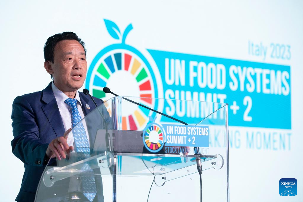 FAO Director-General Qu Dongyu speaks at the closing ceremony of the United Nations Food Systems Summit +2 Stocktaking Moment (UNFSS+2) in Rome, Italy, on July 26, 2023. Three days of high-level stocktaking talks on food security have underlined the challenges that lie ahead, said the head of the United Nations Food and Agriculture Organization (FAO) on Wednesday. (Giulio Napolitano/FAO/Handout via Xinhua)