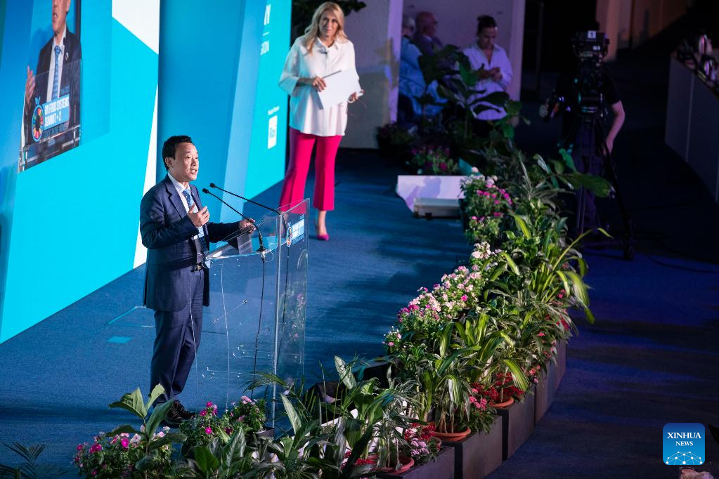 FAO Director-General Qu Dongyu (1st L) speaks at the closing ceremony of the United Nations Food Systems Summit +2 Stocktaking Moment (UNFSS+2) in Rome, Italy, on July 26, 2023. Three days of high-level stocktaking talks on food security have underlined the challenges that lie ahead, said the head of the United Nations Food and Agriculture Organization (FAO) on Wednesday. (Alessandra Benedetti/FAO/Handout via Xinhua)