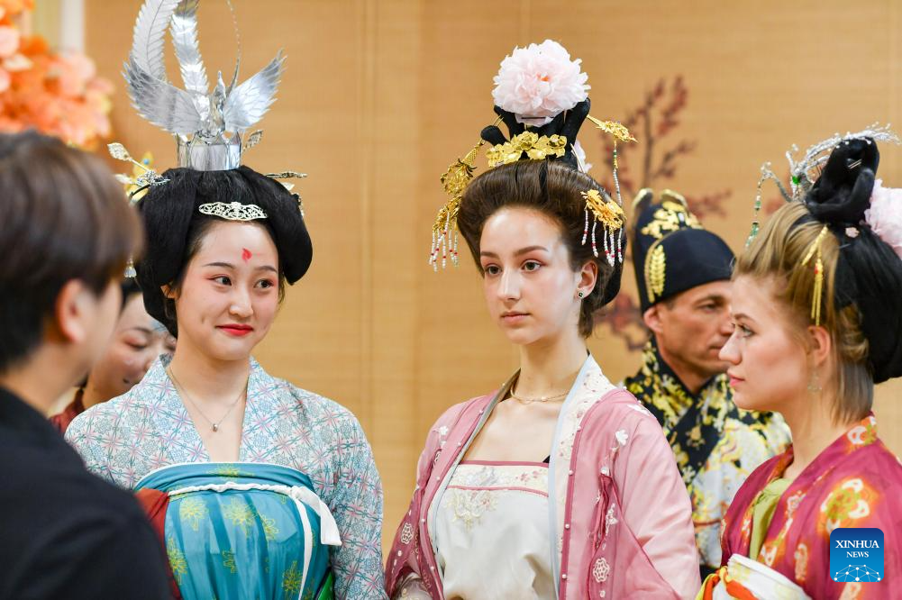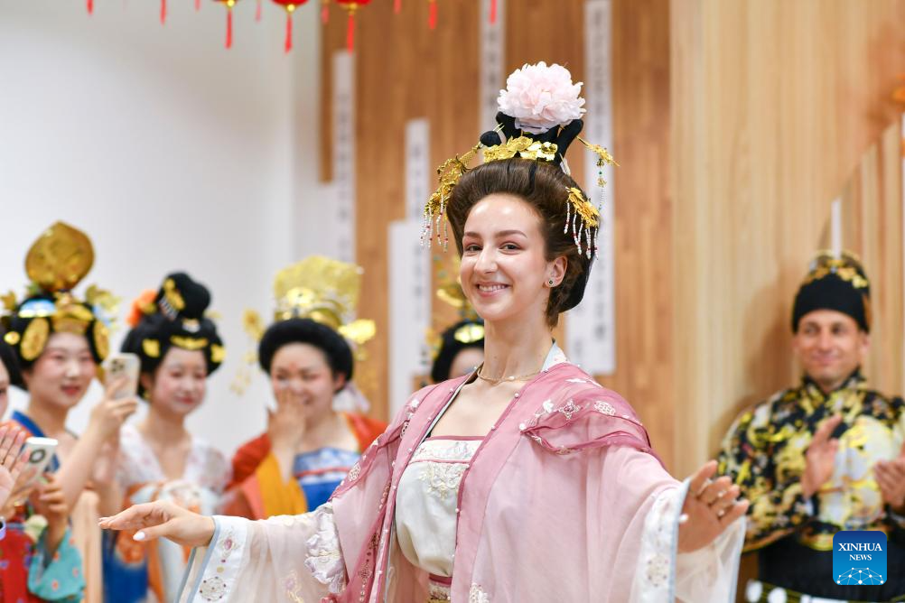 Sofia tries a traditional Chinese costume at the Xinjiang Library in Urumqi, capital of northwest China's Xinjiang Uygur Autonomous Region, on July 23, 2023. (Xinhua/Hu Huhu)?