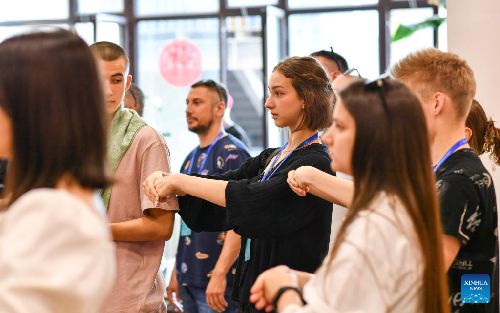 Sofia (C) learns paper-cutting at the Xinjiang Library in Urumqi, capital of northwest China's Xinjiang Uygur Autonomous Region, on July 23, 2023. (Xinhua/Hu Huhu)