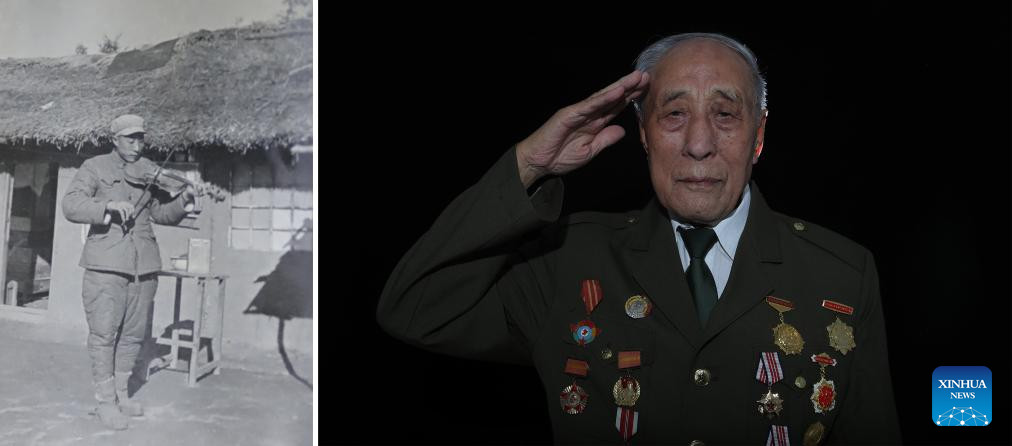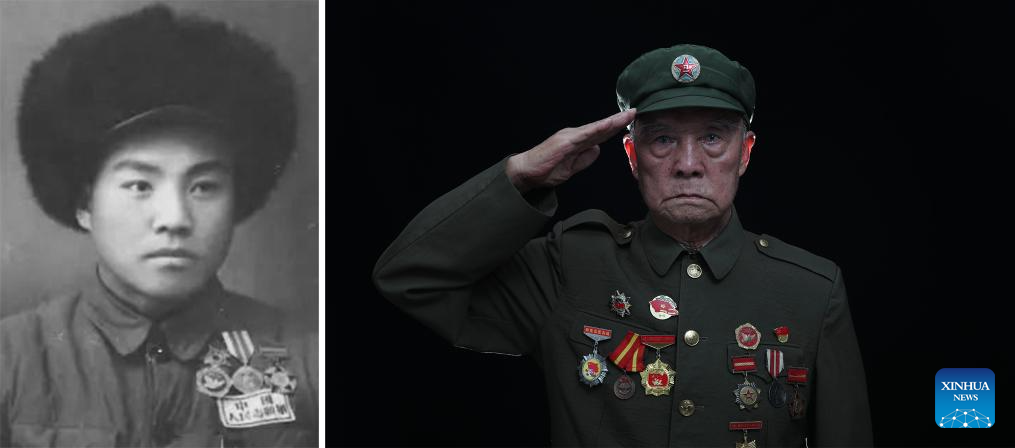 This combo photo shows the portrait of Xiang Fengyu on July 4, 2023. Born in 1933, Xiang participated in the War to Resist U.S. Aggression and Aid Korea in 1951, serving as a communication officer. (Xinhua/Yang Qing)