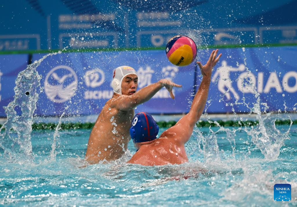 Tan Hengye (L) of China competes during the men's water polo group B match between China and Georgia at the 31st FISU Summer World University Games in Chengdu, southwest China's Sichuan Province, July 27, 2023. (Xinhua/Liu Lei)